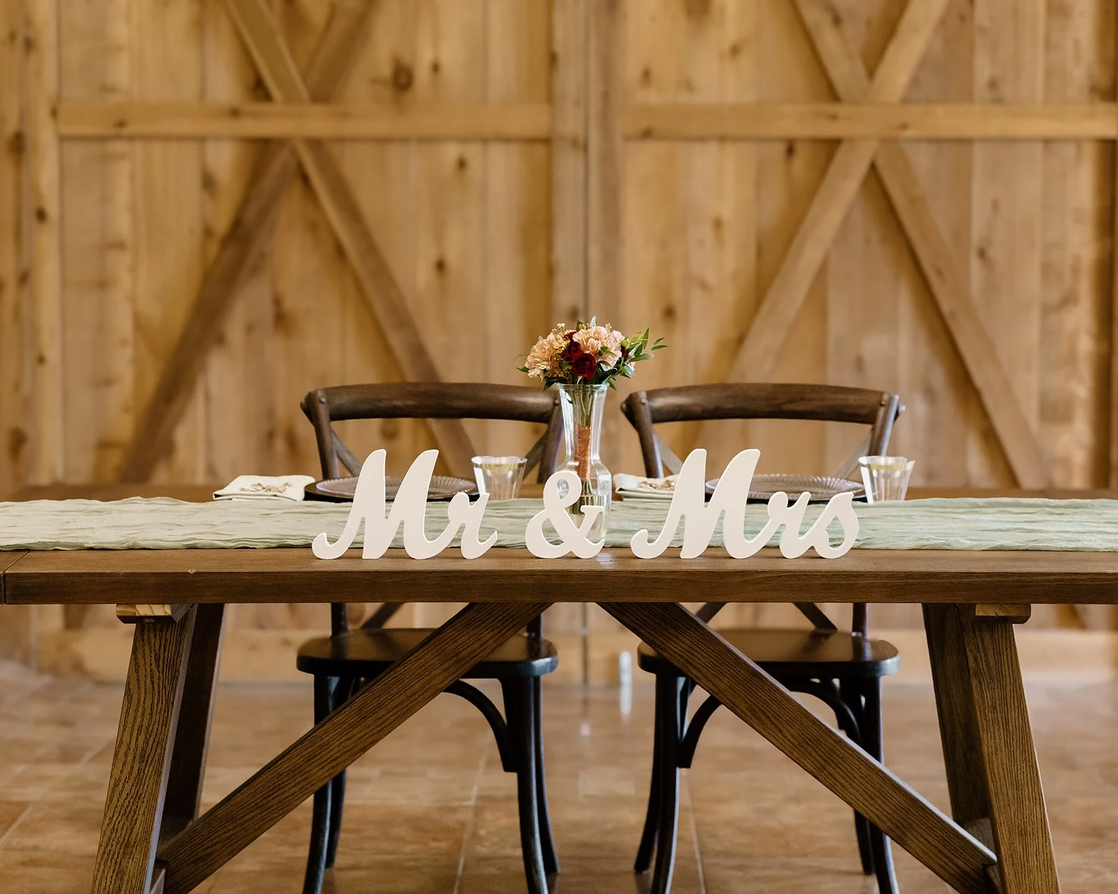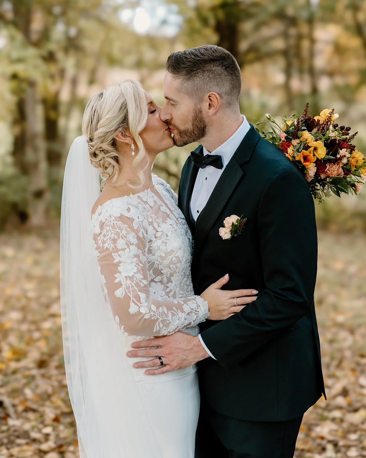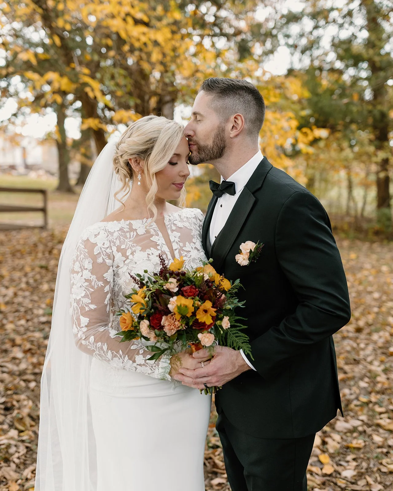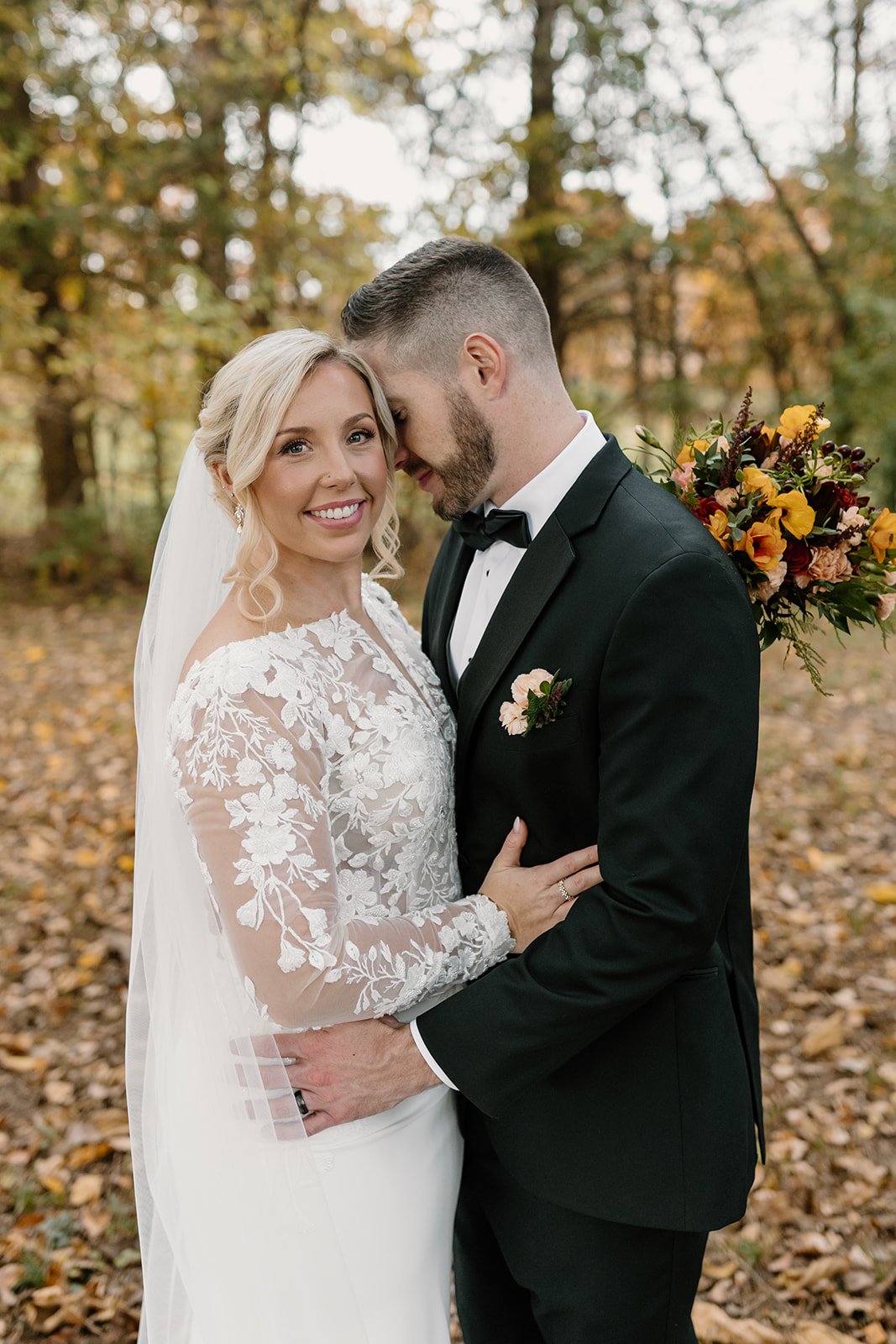 Taylor & Blake were married on November 8, 2025, on a perfect late-fall day with slightly overcast skies — the kind of weather that feels cozy and photographs beautifully. Their wedding featured a palette of sage and gold paired with fall-inspired florals, creating a look that felt warm, elegant, and timeless.